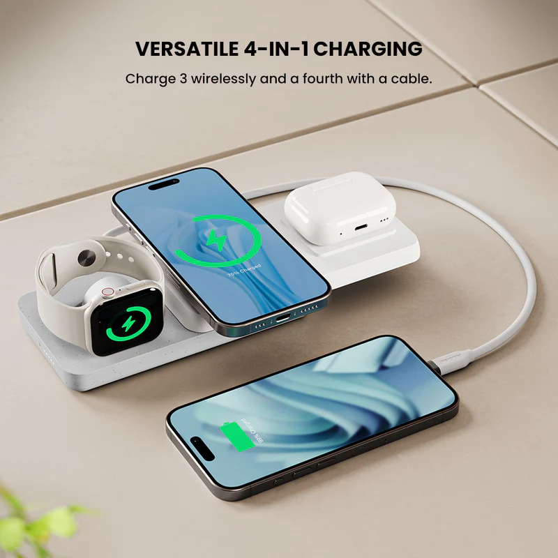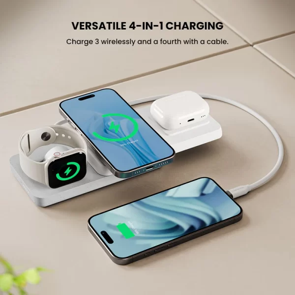 - 4-in-1 Charging: Wirelessly Charge your Phone, AirPods and Apple Watch – with an additional device charged via the USB-C Input